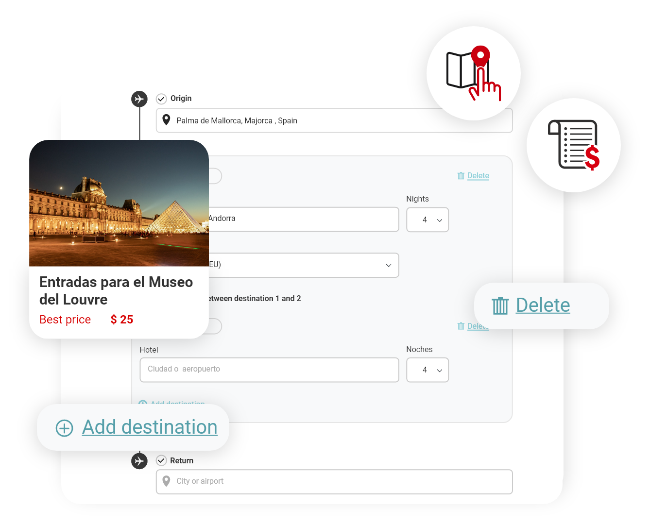 With our travel planning solution, your clients can easily create their own itinerary, including flights, hotels and other additional services from the same website. Our intuitive map will allow you to have a global and detailed vision of your trip, including route, dates, nights and added services.