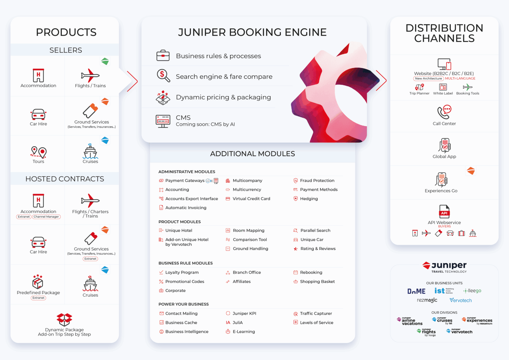 El núcleo de nuestra solución es un potente motor de reservas para OTAs, DMCs, Touroperadores, Bancos de Camas, Cruceros y Aerolíneas, diseñado para gestionar todo el proceso de comercialización turística desde una única plataforma. Con Juniper Booking Engine podrás configurar reglas de negocio, automatizar procesos operativos y aplicar tarifas dinámicas y estrategias de empaquetado inteligente que aumentan la conversión.